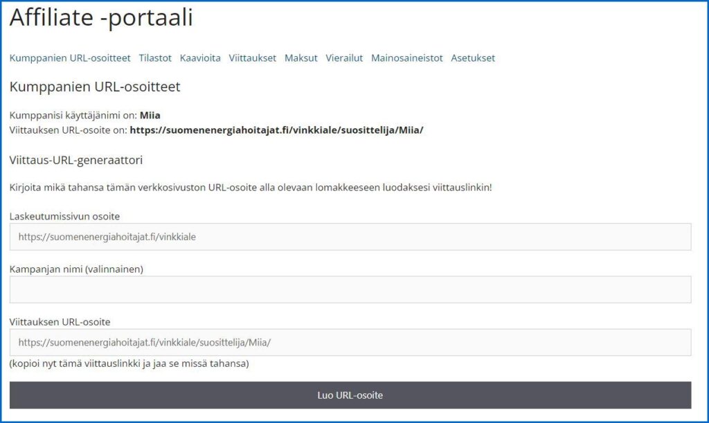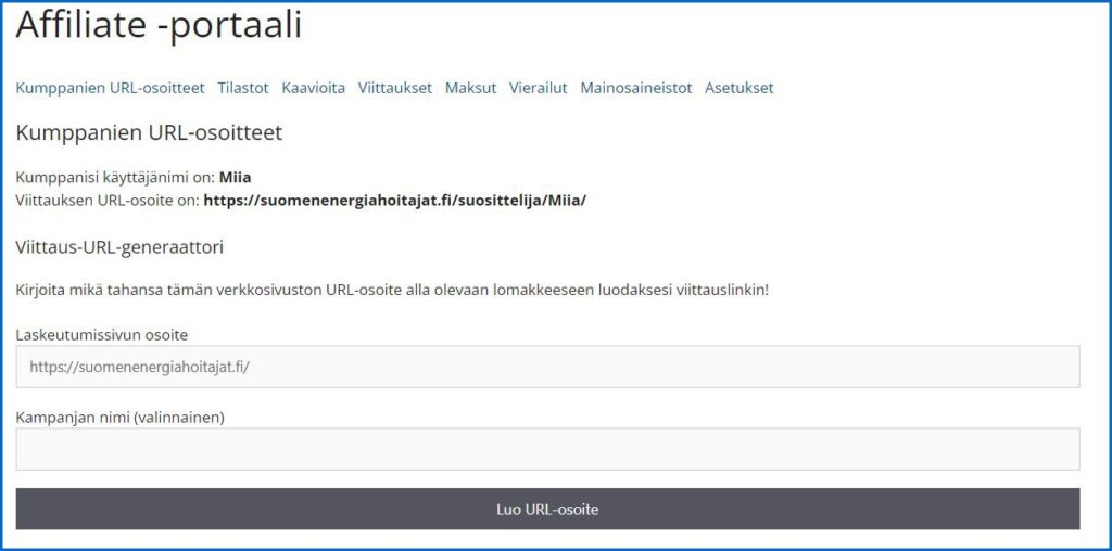 Alla kuva Affiliate-portaalista jossa valittu kohta: “Kumppanien URL-osoitteet”