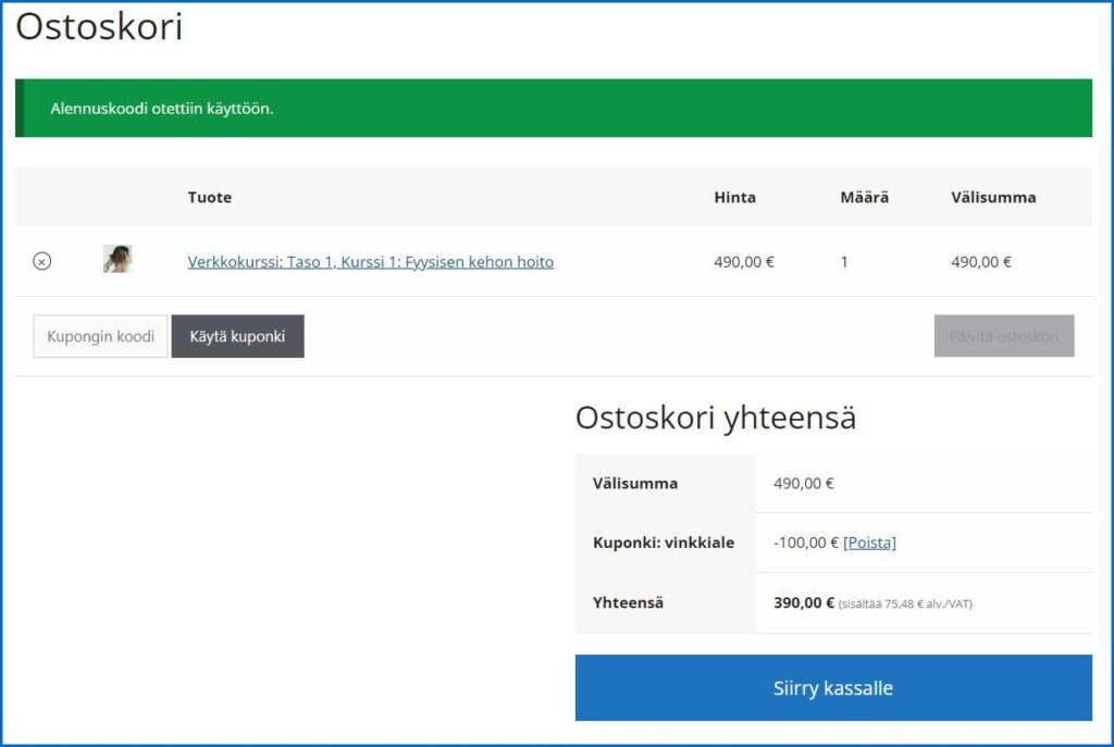 Voit nyt jakaa tätä linkkiä mikä sisältää alennuskoodin valmiina. Tämä linkki vie asiakkaan suoraan ostoskoriin jonne on lisätty Fyysisen kehon hoito -verkkokurssi ja alennus on myös valmiina ostoskorissa.